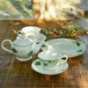 ボーンチャイナ製の上質な食器には、楠を背景に数枚の葉がふわりと舞います。