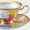 ギリシャのアフロディテ宮殿の庭に想を得て、エレガントな薔薇の大輪や愛らしい花が輪舞するよう花園を器に再現しました。 バラ、藤、ハーブ(ネモフィラ、マトリカリアなど)が手描きで描かれています。美しいグラデーションはスポンジでやさしく絵具を馴染ませる「たたき技法」を用いて繊細に表現。 カップの内側にはティアラをモチーフとした繊細な金彩を配し、手描きの花々を引き立てています。