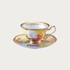 ギリシャのアフロディテ宮殿の庭に想を得て、エレガントな薔薇の大輪や愛らしい花が輪舞するよう花園を器に再現しました。 バラ、藤、ハーブ(ネモフィラ、マトリカリアなど)が手描きで描かれています。美しいグラデーションはスポンジでやさしく絵具を馴染ませる「たたき技法」を用いて繊細に表現。 カップの内側にはティアラをモチーフとした繊細な金彩を配し、手描きの花々を引き立てています。