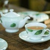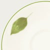 ボーンチャイナ製の上質な食器には、楠を背景に数枚の葉がふわりと舞います。