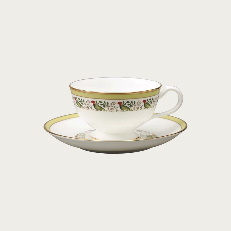 ノリタケ アーカイブコレクション ノリタケの過去のデザインアーカイブをモチーフに制作された、レトロな味わいのあるコレクションです。 ノリタケ創立の地であるノリタケの森にある製造工場「クラフトセンター」で、職人の手により絵付けされています。 ※ノリタケスリランカ工場にて製造した生地をクラフトセンターにて絵付けしています。 <若草色絵鳥文> 1910~30年代に流行したアール・デコ期のデザインは、オールドノリタケの中でも人気の高いデザイン。1920年代に描かれたとみられるデザイン画から生まれたアール・デコ期らしい鳥をモチーフとしたカラフルなカップ&ソーサーです。