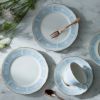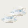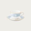 幸せな結婚生活を送るために古くからヨーロッパに伝わる4つのおまじない「Something Four」の中の「Something Blue」にちなんで、清潔感あふれるペールブルーをメインカラーとして使用しています。青は清らかさを象徴する幸せの色。青色を密かに身につけて幸せを願う花嫁の気持ちを反映したデザインです。花嫁のドレスを連想させるエレガントなレース模様を、ノリタケの誇る美しい「白盛技法」で表現しました。