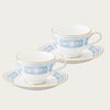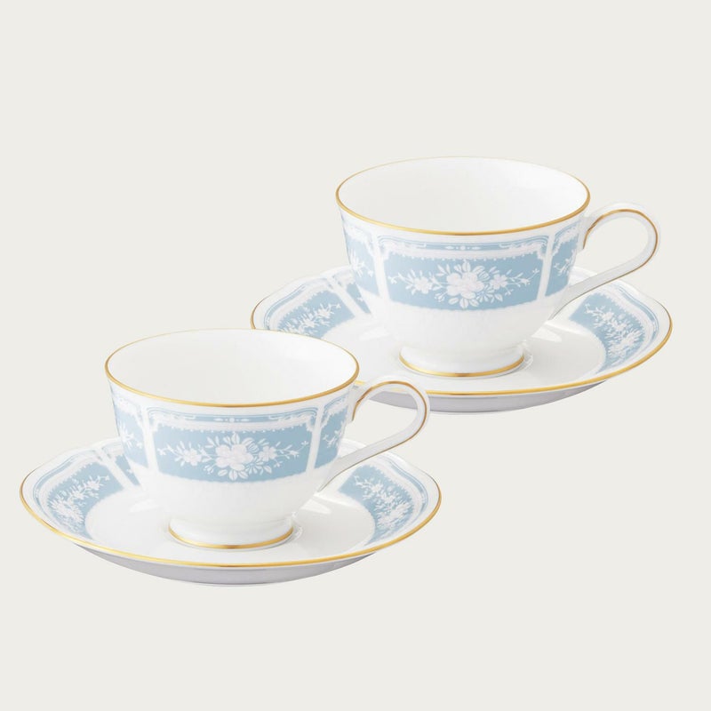 幸せな結婚生活を送るために古くからヨーロッパに伝わる4つのおまじない「Something Four」の中の「Something Blue」にちなんで、清潔感あふれるペールブルーをメインカラーとして使用しています。青は清らかさを象徴する幸せの色。青色を密かに身につけて幸せを願う花嫁の気持ちを反映したデザインです。花嫁のドレスを連想させるエレガントなレース模様を、ノリタケの誇る美しい「白盛技法」で表現しました。