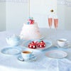 やさしいペールブルーに高級感を添えるのは、立体感と繊細さをあわせもつ「白盛」技法。ノリタケが得意とする技法のひとつです。この技法で表現されたレースやブーケ模様が上品でエレガントな雰囲気。清潔感のあるブルーを基調としながらも、あたたかみを感じる器となるよう、差し色にほんのり淡いベビーピンクを施しています。一見王道フェミニンなデザインですが、細部にわたりこだわりを尽くした、長く飽きることなくお使いいただけるデザインです。