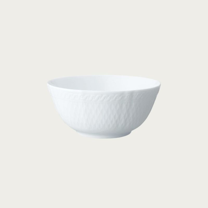 細かい部分まで丁寧にレリーフを施し、日本の洋食器メーカーならではの繊細さを表現しました。古来より日本で親しまれている立涌(たてわく)文様(※1)を現在風にアレンジしたレリーフは、純白で柔らかな表情を引き締めています。縁まわりのレリーフは、連続模様が永遠を表すと言われるギリシャ文様。オールドノリタケ(※2)にも多く用いられ、何世紀にもわたり受け継がれるモチーフに、親から子へ何代にもわたってお使いいただけますように、との思いを込めました。