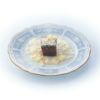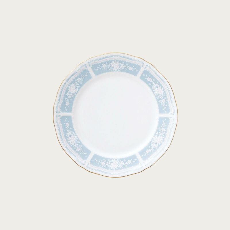 幸せな結婚生活を送るために古くからヨーロッパに伝わる4つのおまじない「Something Four」の中の「Something Blue」にちなんで、清潔感あふれるペールブルーをメインカラーとして使用しています。青は清らかさを象徴する幸せの色。青色を密かに身につけて幸せを願う花嫁の気持ちを反映したデザインです。花嫁のドレスを連想させるエレガントなレース模様を、ノリタケの誇る美しい「白盛技法」で表現しました。