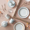 やさしいペールブルーに高級感を添えるのは、立体感と繊細さをあわせもつ「白盛」技法。ノリタケが得意とする技法のひとつです。この技法で表現されたレースやブーケ模様が上品でエレガントな雰囲気。清潔感のあるブルーを基調としながらも、あたたかみを感じる器となるよう、差し色にほんのり淡いベビーピンクを施しています。一見王道フェミニンなデザインですが、細部にわたりこだわりを尽くした、長く飽きることなくお使いいただけるデザインです。