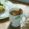 ボーンチャイナ製の上質な食器には、楠を背景に数枚の葉がふわりと舞います。