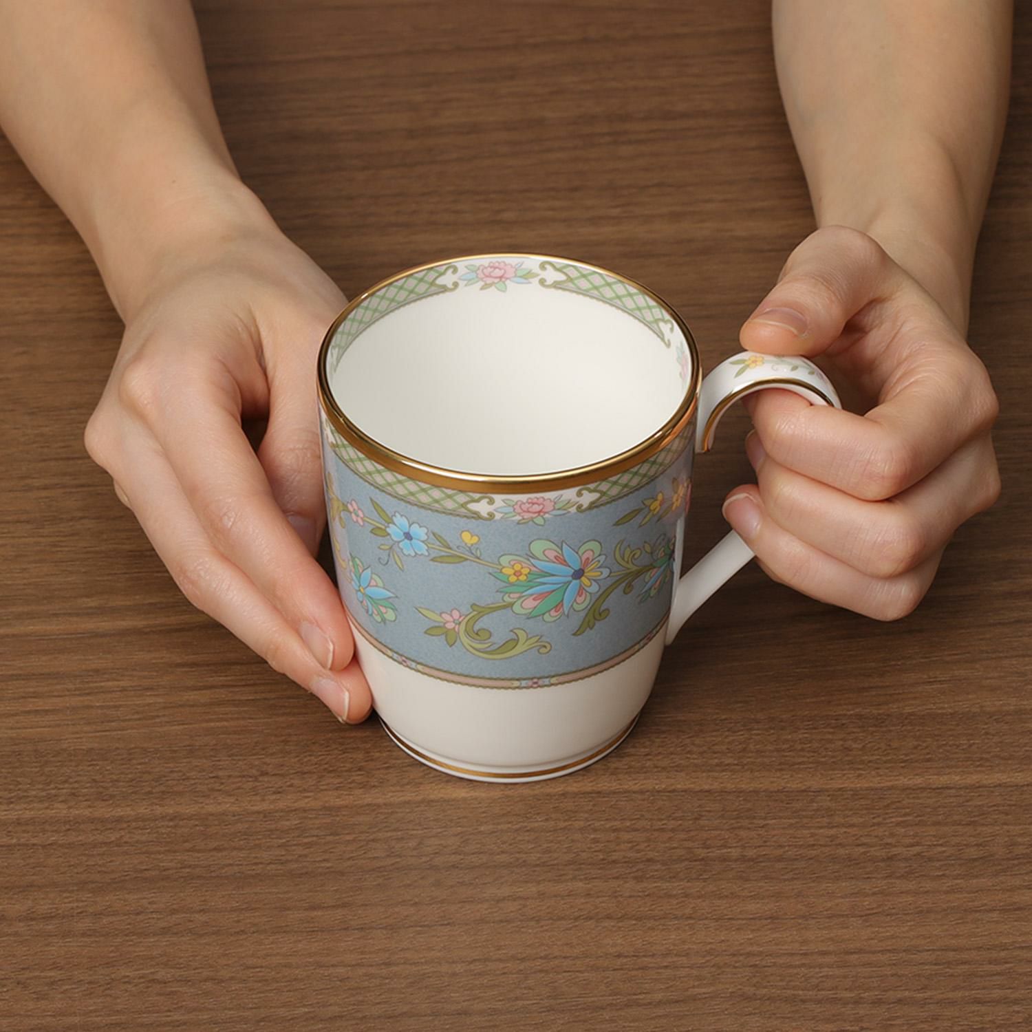 カップに咲き誇る花々は吉野山の桜、ソーサーの緑色は裾野の緑をイメージ。カップの内側に絵柄があしらわれ、紅茶の水色越しに揺れる絵柄を愛でていただける趣向もまた優雅です。