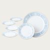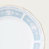 幸せな結婚生活を送るために古くからヨーロッパに伝わる4つのおまじない「Something Four」の中の「Something Blue」にちなんで、清潔感あふれるペールブルーをメインカラーとして使用しています。青は清らかさを象徴する幸せの色。青色を密かに身につけて幸せを願う花嫁の気持ちを反映したデザインです。花嫁のドレスを連想させるエレガントなレース模様を、ノリタケの誇る美しい「白盛技法」で表現しました。