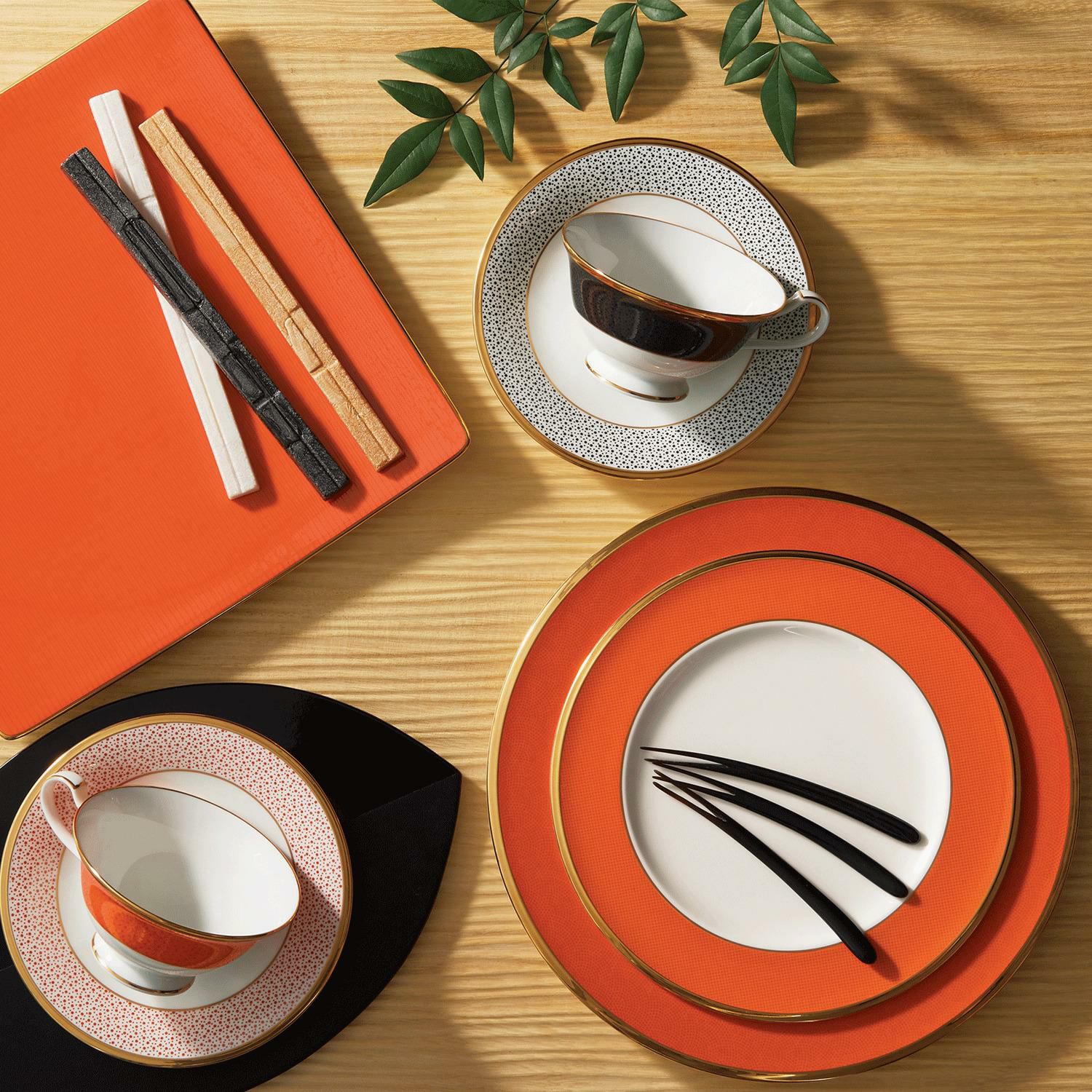 明(アケ・アカ)とも呼ばれる朱色(オレンジ)は、縄文時代から続くとされる伝統色で、漆器の色としても日本人にはなじみ深いものです。 ノリタケが新たに開発した“安全、安心”なオレンジ絵具を活かし、日本古来の伝統色"朱色"を鮮やかに表現しました。 武士の第一礼装である裃(かみしも)から発祥した江戸小紋の柄の中から、江戸小紋五役と呼ばれる、「鮫」「行儀」「万筋」「大小あられ」をテクスチャーで配したテーブルウェア。色違いの墨小紋 SUMI KOMONとの組み合わせもお楽しみください。