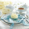 幸せな結婚生活を送るために古くからヨーロッパに伝わる4つのおまじない「Something Four」の中の「Something Blue」にちなんで、清潔感あふれるペールブルーをメインカラーとして使用しています。青は清らかさを象徴する幸せの色。青色を密かに身につけて幸せを願う花嫁の気持ちを反映したデザインです。花嫁のドレスを連想させるエレガントなレース模様を、ノリタケの誇る美しい「白盛技法」で表現しました。