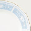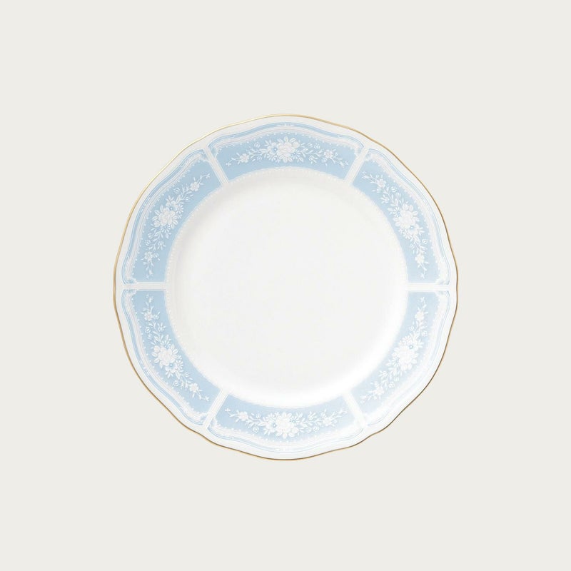 幸せな結婚生活を送るために古くからヨーロッパに伝わる4つのおまじない「Something Four」の中の「Something Blue」にちなんで、清潔感あふれるペールブルーをメインカラーとして使用しています。青は清らかさを象徴する幸せの色。青色を密かに身につけて幸せを願う花嫁の気持ちを反映したデザインです。花嫁のドレスを連想させるエレガントなレース模様を、ノリタケの誇る美しい「白盛技法」で表現しました。