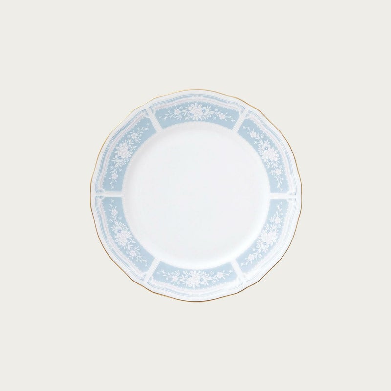 幸せな結婚生活を送るために古くからヨーロッパに伝わる4つのおまじない「Something Four」の中の「Something Blue」にちなんで、清潔感あふれるペールブルーをメインカラーとして使用しています。青は清らかさを象徴する幸せの色。青色を密かに身につけて幸せを願う花嫁の気持ちを反映したデザインです。花嫁のドレスを連想させるエレガントなレース模様を、ノリタケの誇る美しい「白盛技法」で表現しました。