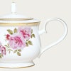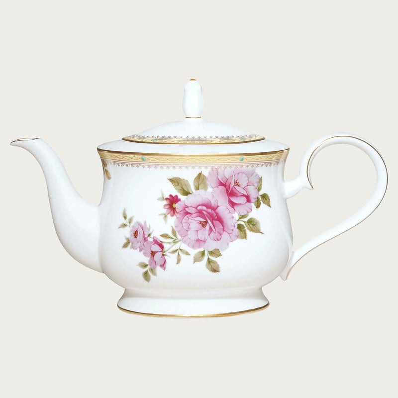 水彩タッチで優しく描いたピンクのバラが明るく華やか。繊細で優雅な金模様とエメラルドの半球盛が高級感を醸し出します。リラックスした雰囲気のティータイムを演出します。