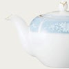 幸せな結婚生活を送るために古くからヨーロッパに伝わる4つのおまじない「Something Four」の中の「Something Blue」にちなんで、清潔感あふれるペールブルーをメインカラーとして使用しています。青は清らかさを象徴する幸せの色。青色を密かに身につけて幸せを願う花嫁の気持ちを反映したデザインです。花嫁のドレスを連想させるエレガントなレース模様を、ノリタケの誇る美しい「白盛技法」で表現しました。