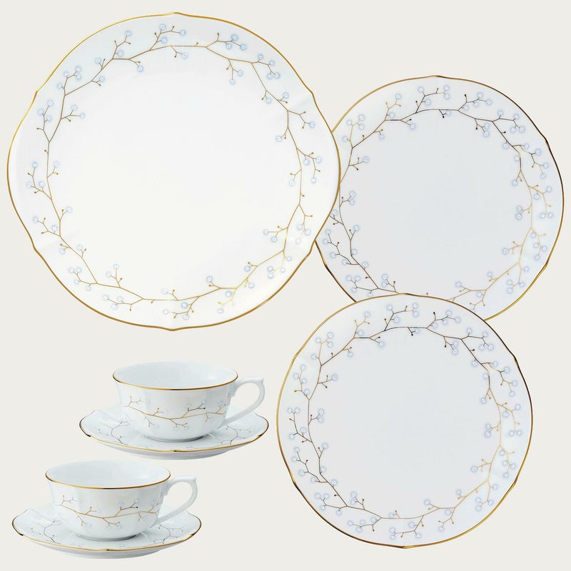 かすみ草の花冠をモチーフにしたシリーズ。白とブルーで表現した爽やかな花が、華やかなゴールドを引き立てます。かすみ草は幸福や感謝を意味し、花冠は永遠の幸せを象徴します。・ホワイトベル一覧