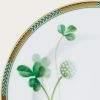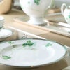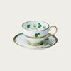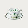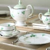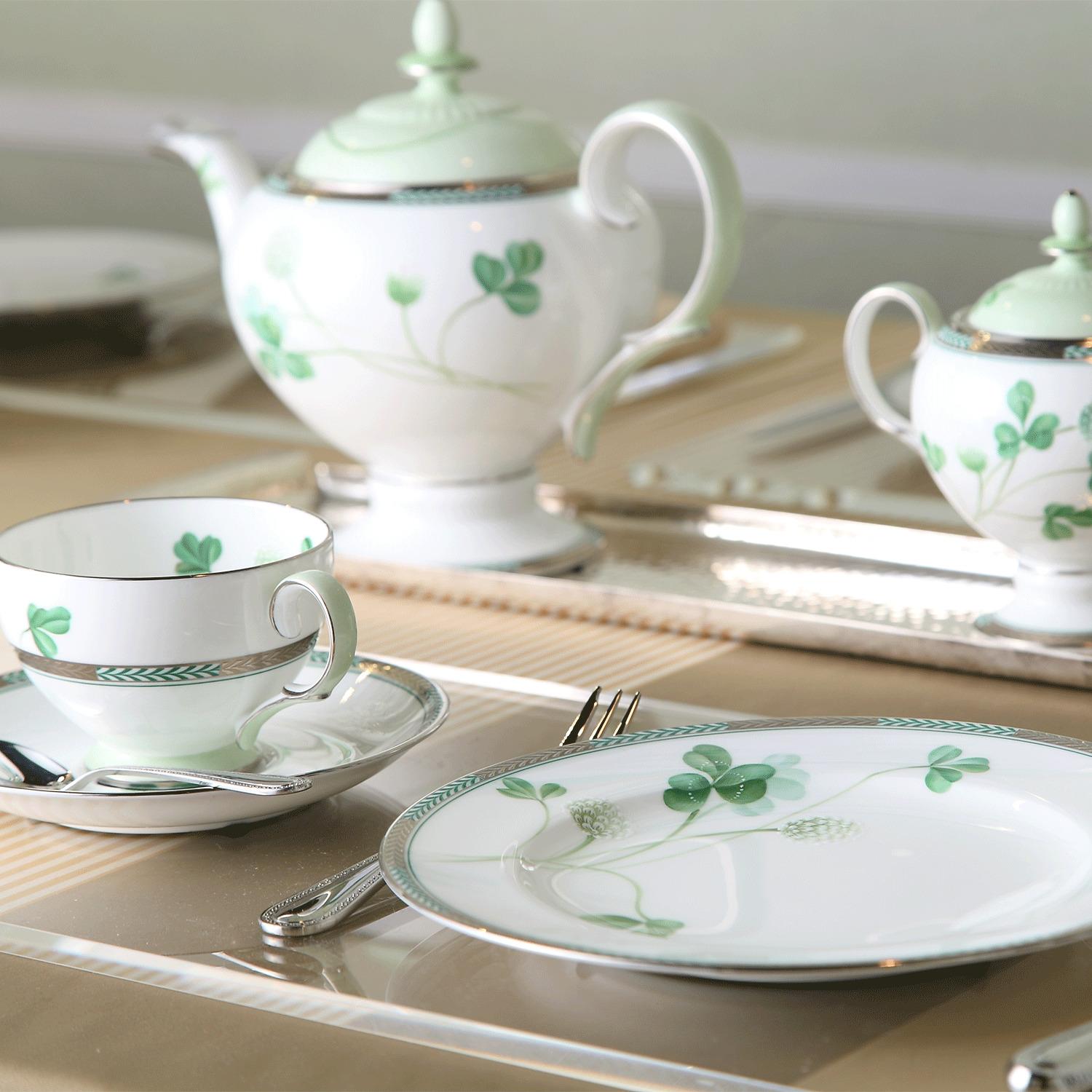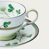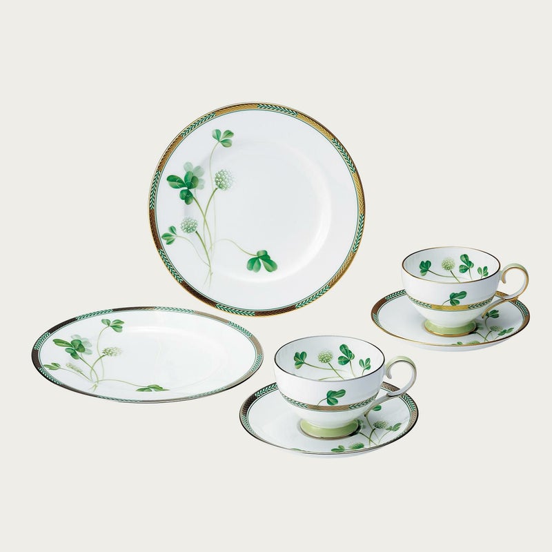 田の畔などに咲く清楚な“しろつめくさ”。葉や茎の柔らかく清々しいグリーンに、立体的な白盛や輝く銀彩と金彩が上品なアクセント。丁寧に素描された爽やかで心癒されるデザインです。 銀のカップ&ソーサーのソーサーに1つだけ四つ葉が隠れています。