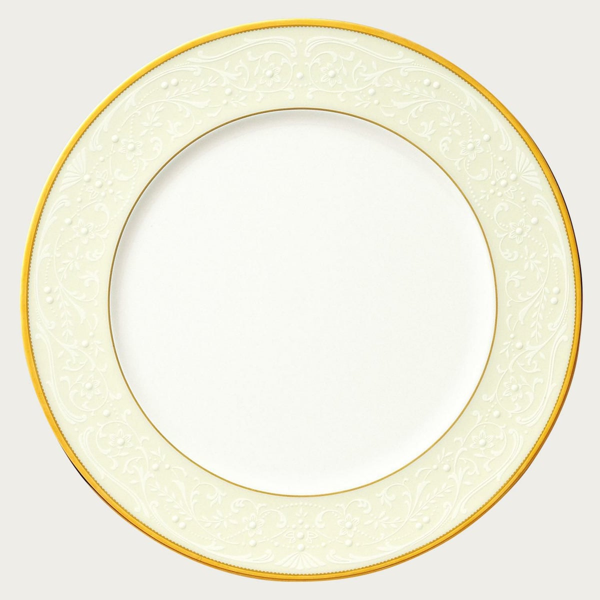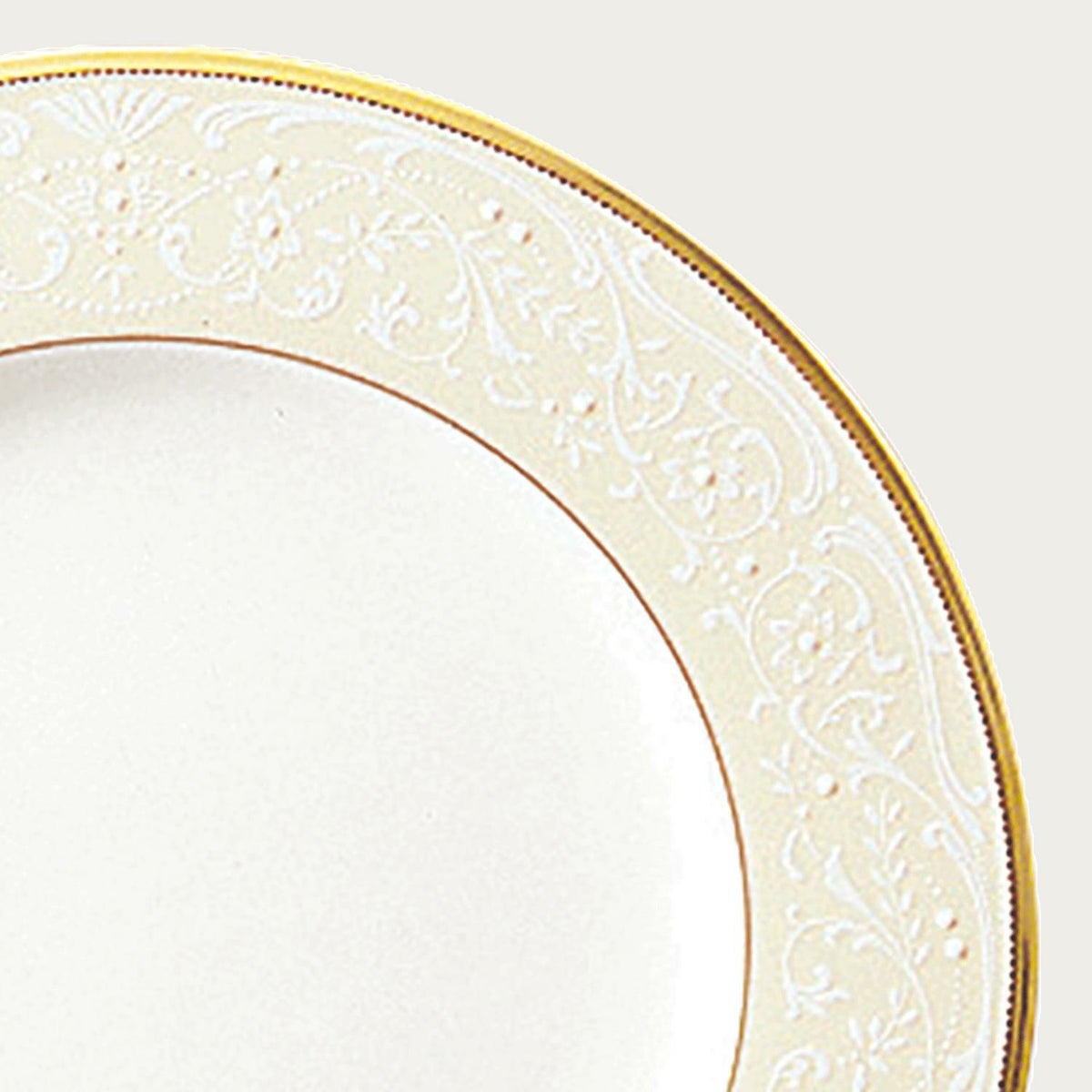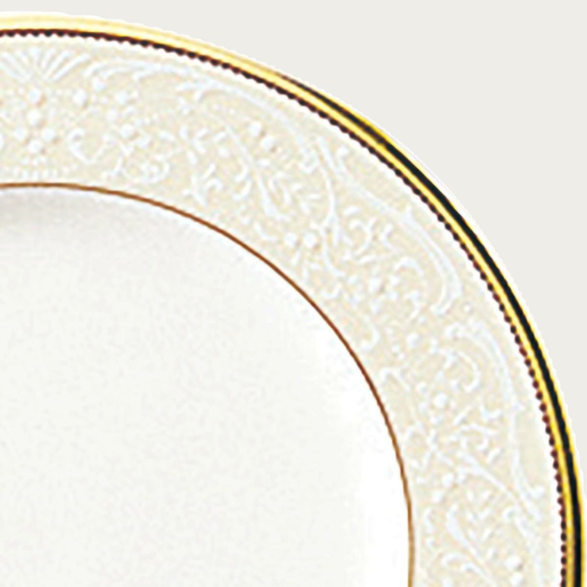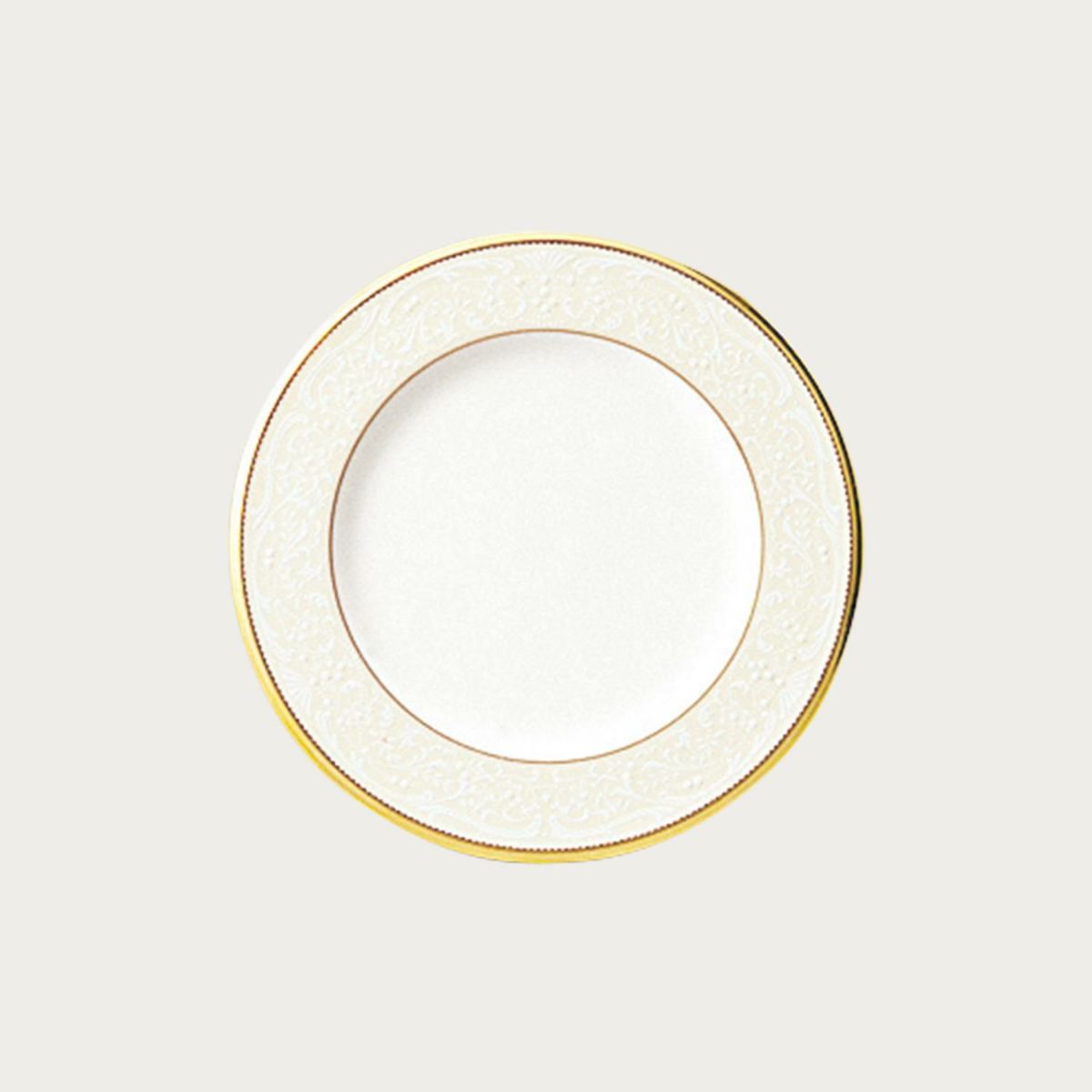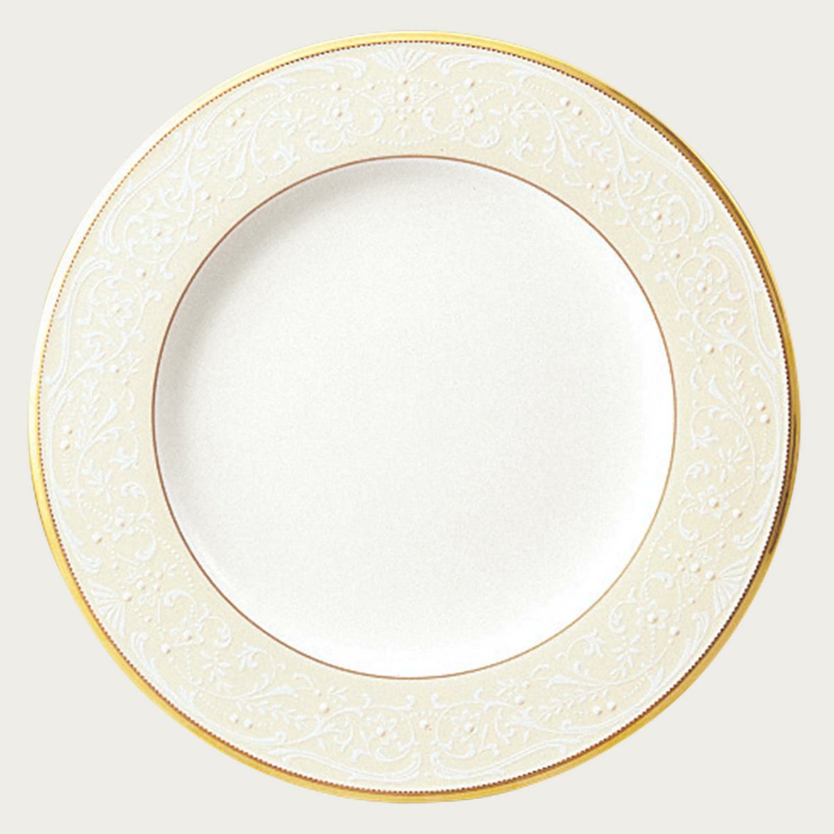 一つ一つ丁寧に手で盛られた半球盛りは、淡いベージュの地色や白盛り技法を用いた唐草とあいまって、リッチでエレガントな雰囲気を醸し出しています。