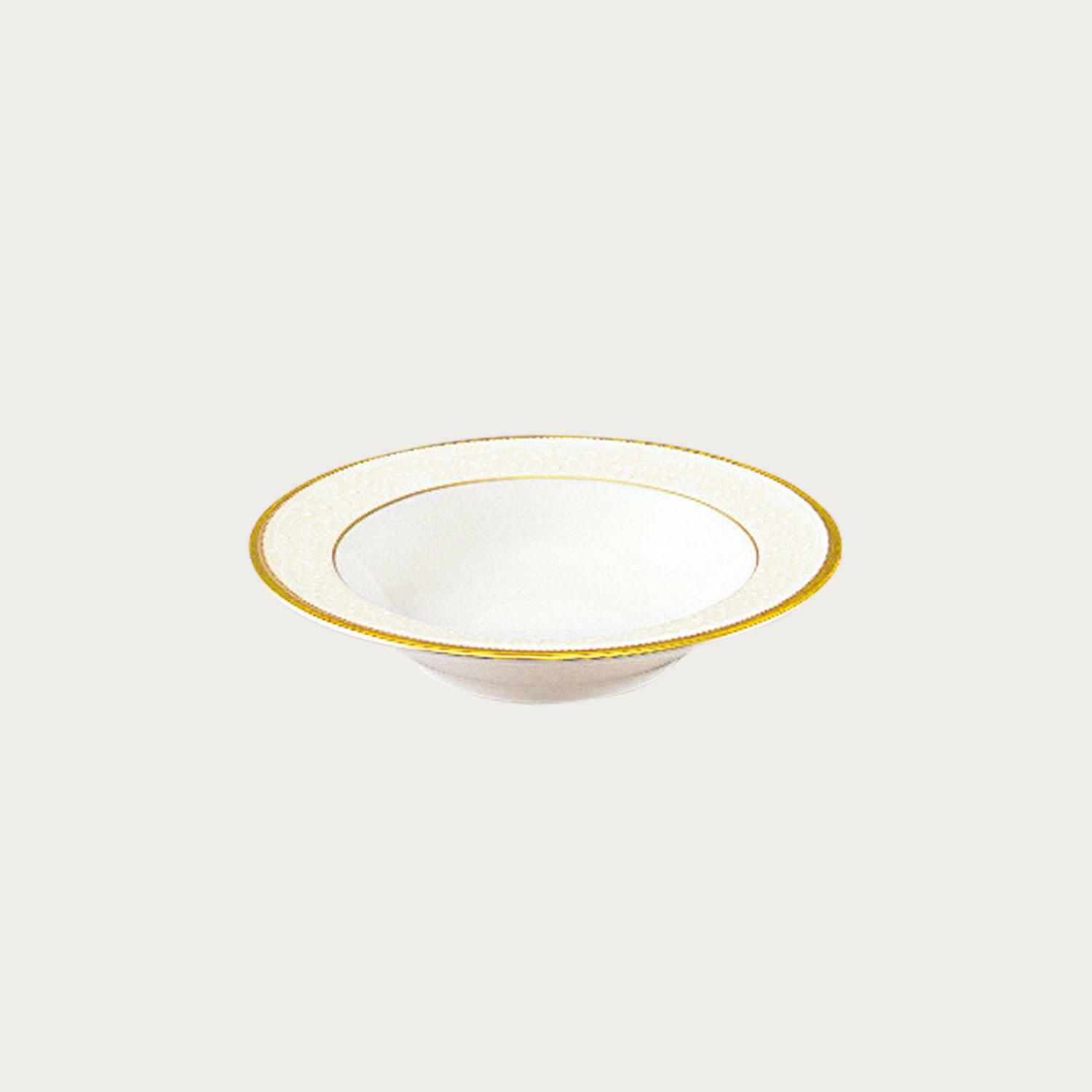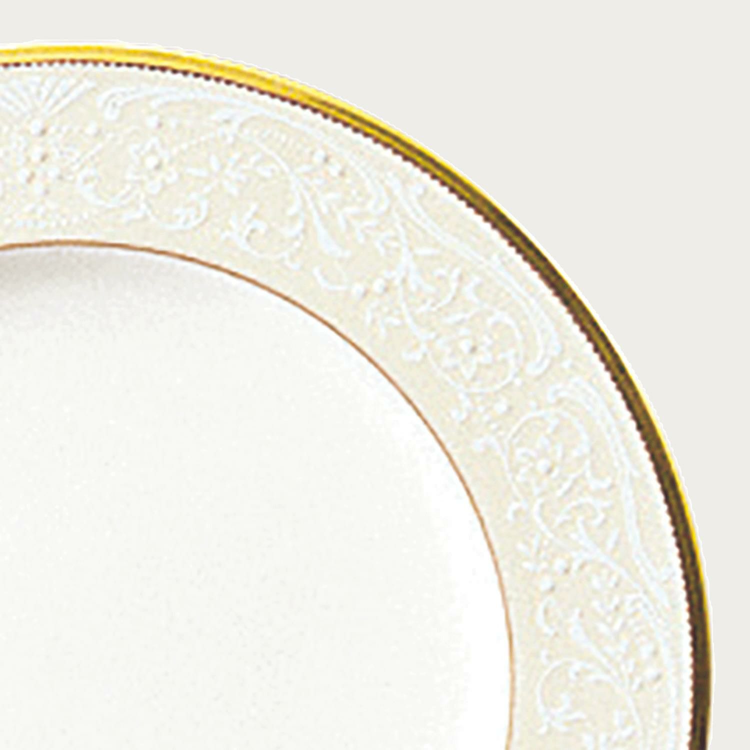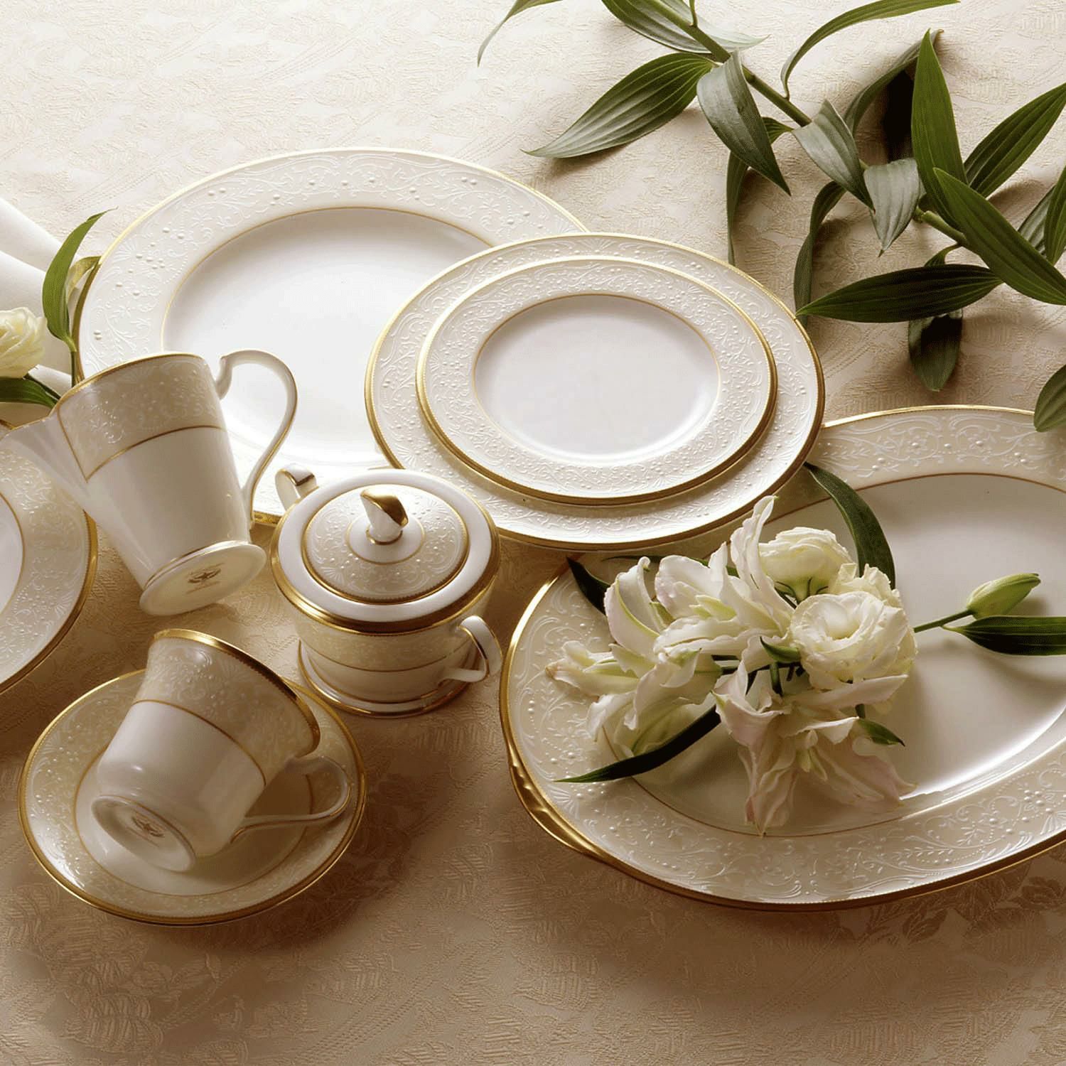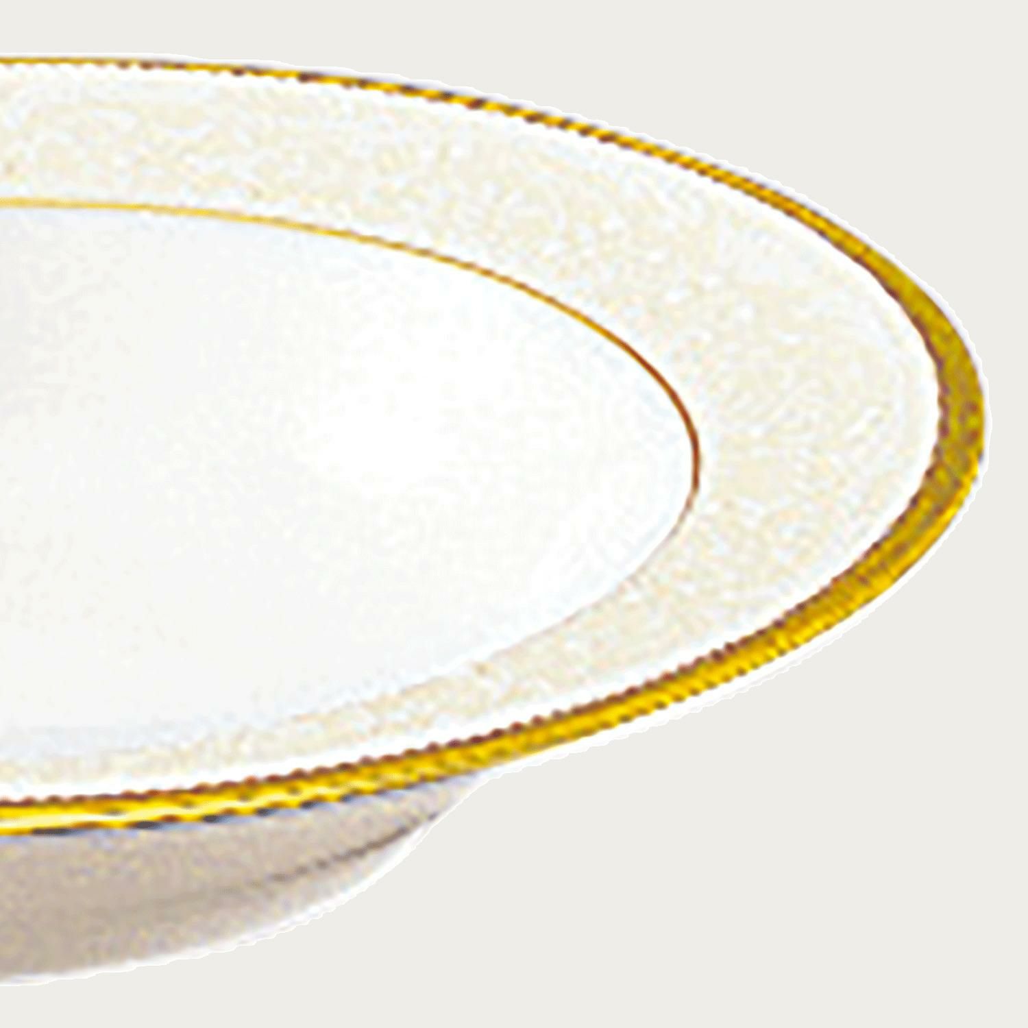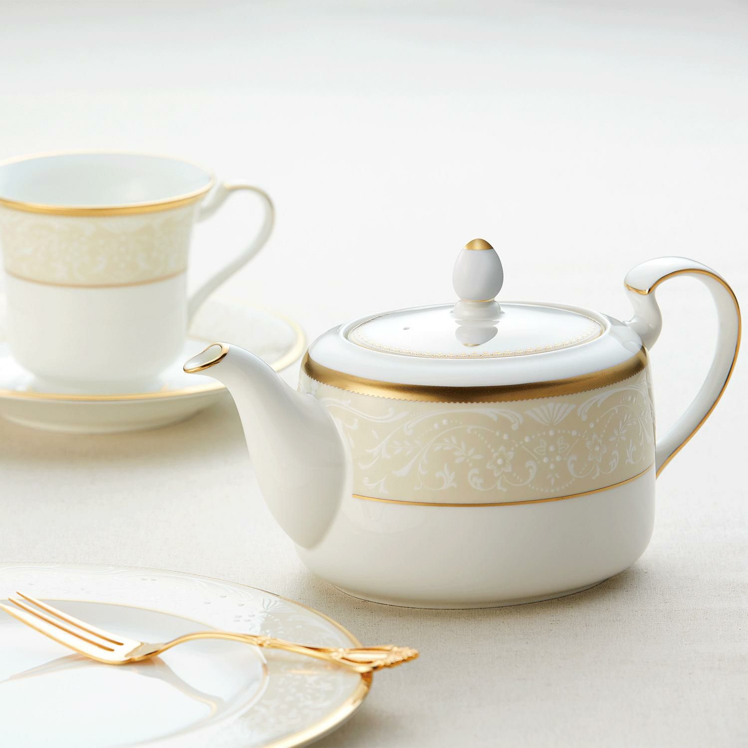 一つ一つ丁寧に手で盛られた半球盛りは、淡いベージュの地色や白盛り技法を用いた唐草とあいまって、リッチでエレガントな雰囲気を醸し出しています。