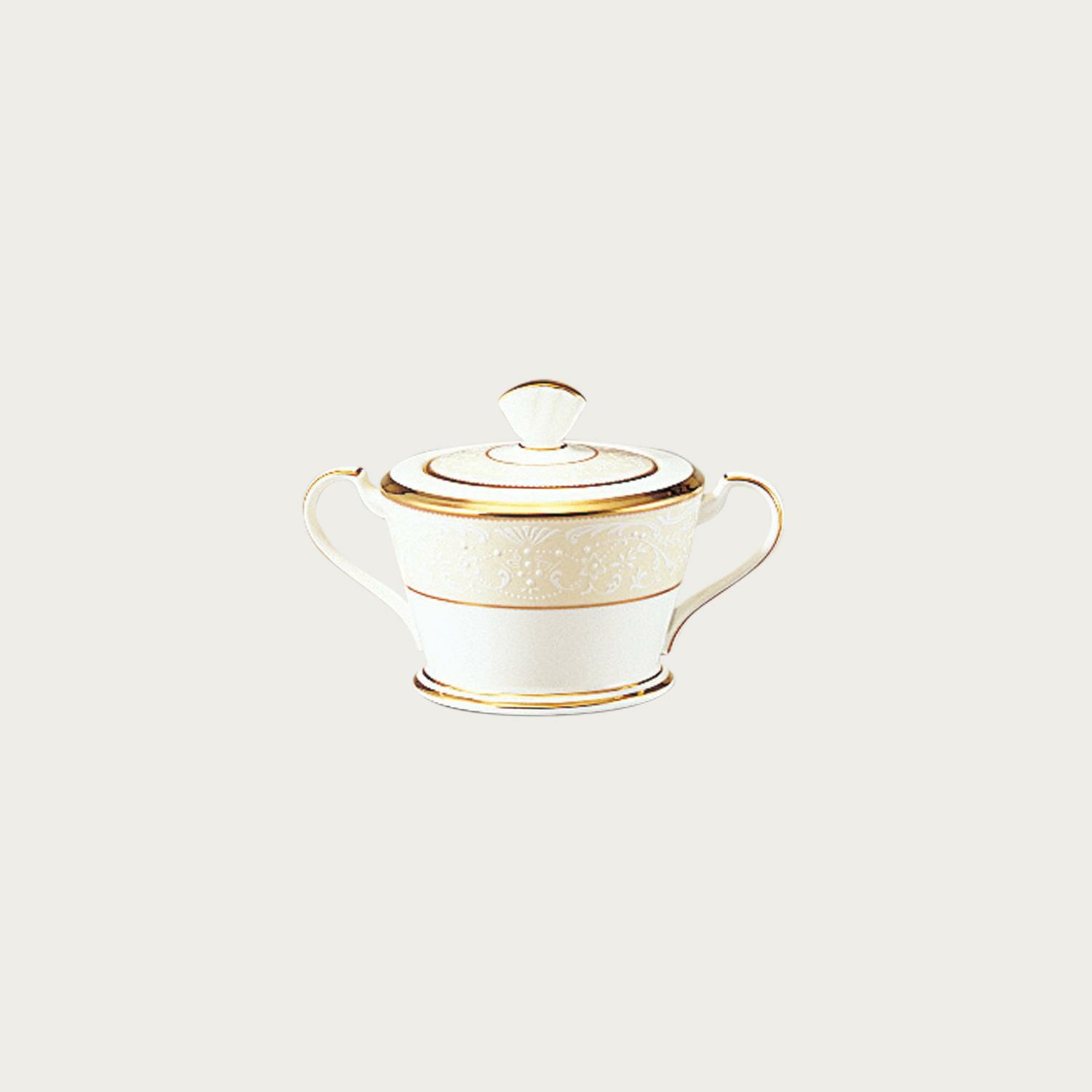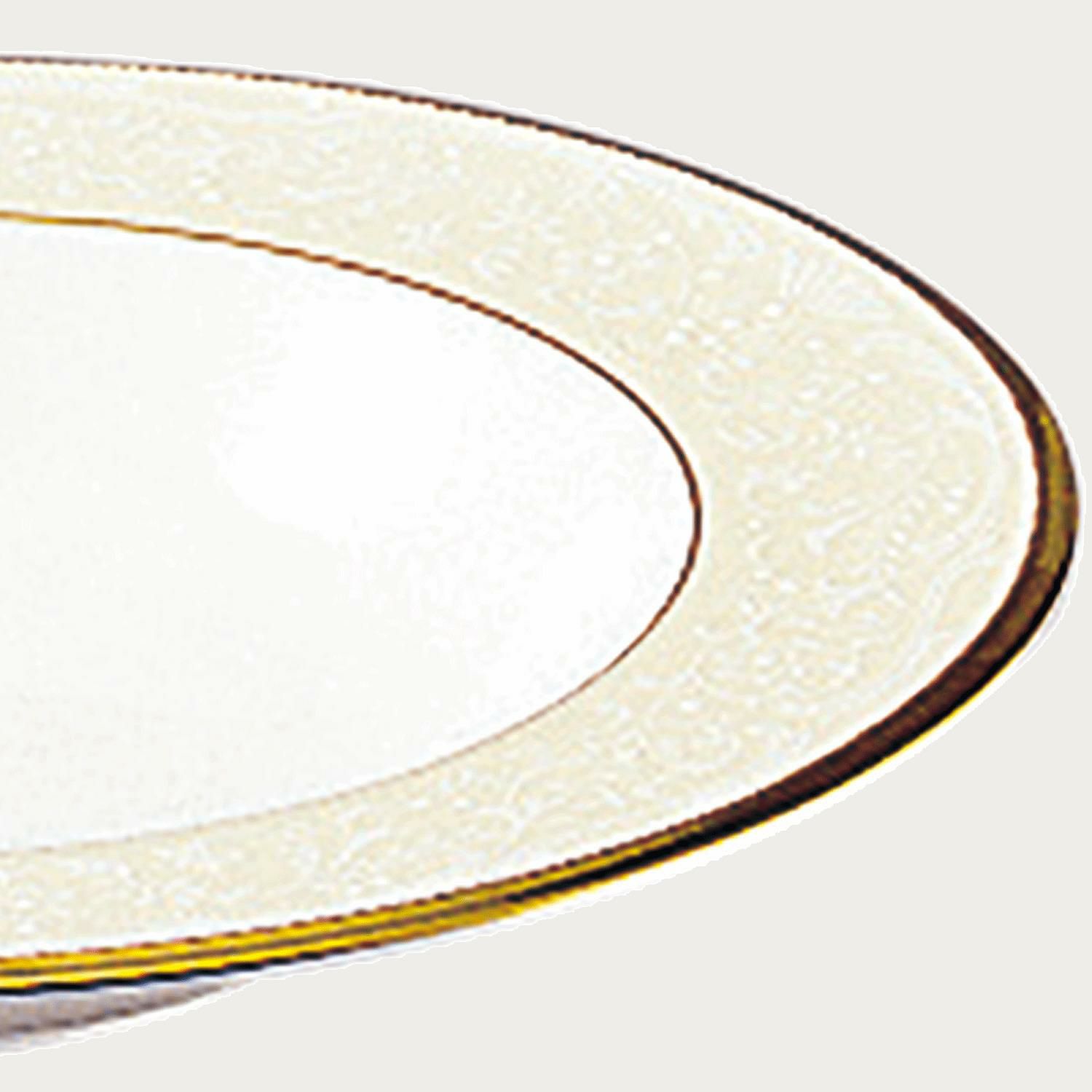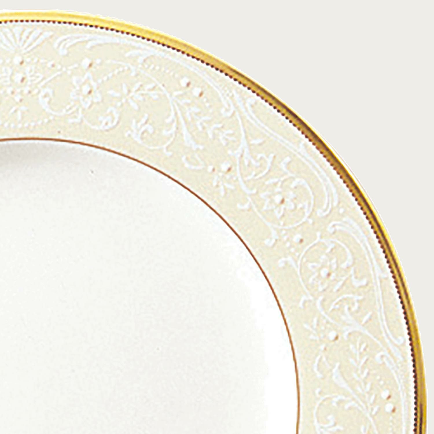 一つ一つ丁寧に手で盛られた半球盛りは、淡いベージュの地色や白盛り技法を用いた唐草とあいまって、リッチでエレガントな雰囲気を醸し出しています。
