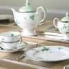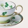 田の畔などに咲く清楚な“しろつめくさ”。葉や茎の柔らかく清々しいグリーンに、立体的な白盛や輝く銀彩と金彩が上品なアクセント。丁寧に素描された爽やかで心癒されるデザインです。 銀のカップ&ソーサーのソーサーに1つだけ四つ葉が隠れています。