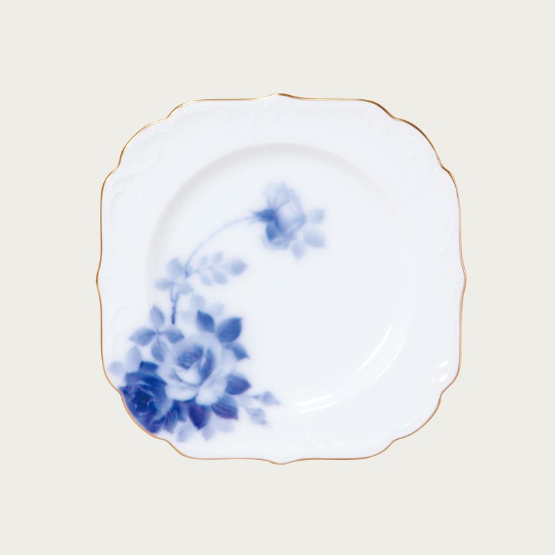 縦横17.5cmのスクエアプレート 斜径20cmで、見た目は少し小さく感じます。 ケーキならひとつ、和菓子が二つ程度のるかな。お揃いのカップ&ソーサーもあるが、66000円と高価でデミタスのように小さく、品良く110cc程度。ただ、不思議にまろやかなとろみを与えてくれる。 カオリン素材による白磁で、手書きブルーローズ、周囲に金彩を施す秀品。