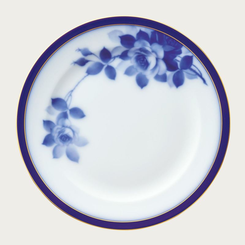 電子レンジ対応のシリーズ。茎をなくしたデザインにすることで、紺青のバラと白磁のコントラストを強調しています。