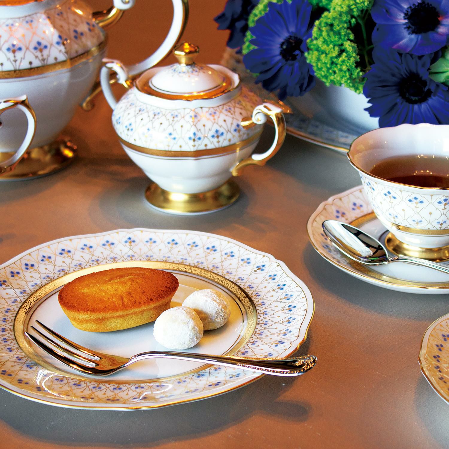矢車菊をモチーフにした上品なデザイン「スイートメモリー」。1979年の大倉陶園創業60周年を記念して製作され、今もなお愛され続けているデザインです。