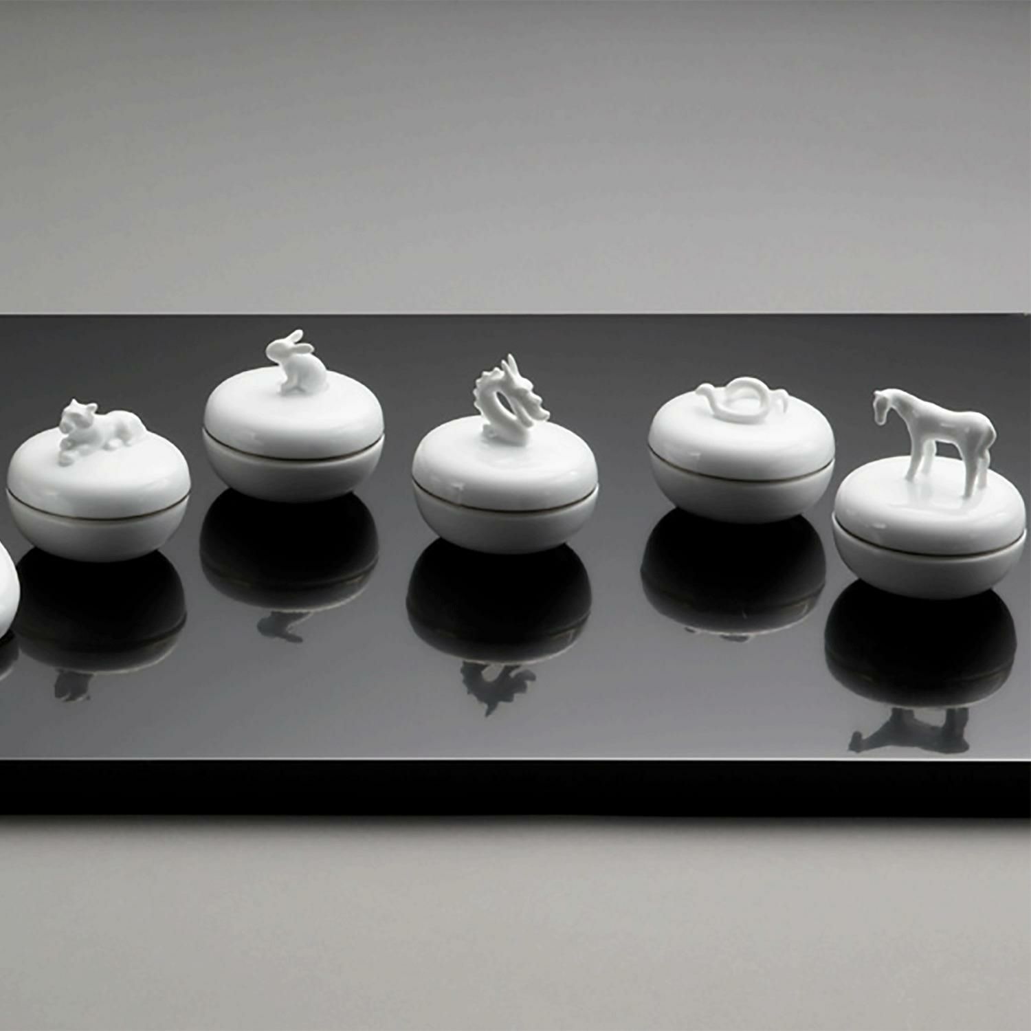 品のよい贈り物として人気の高い干支蓋物(香合)。珠玉のように美しい白磁の香合は、中を純度の高い金彩を、そして蓋の内側には干支文字の落款を施しています。
