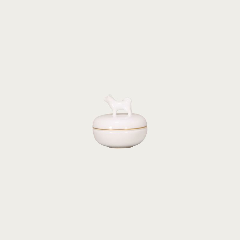 品のよい贈り物として人気の高い干支蓋物(香合)。珠玉のように美しい白磁の香合は、中を純度の高い金彩を、そして蓋の内側には干支文字の落款を施しています。