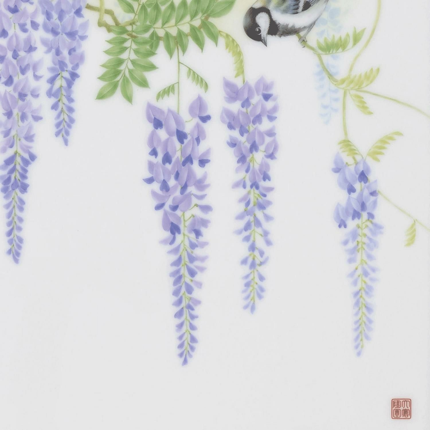 大倉陶園にておよそ半世紀の長きにわたってデザイナーとして活躍し、皇室関係や日本国迎賓館など名誉ある案件を数多くこなしたデザイナー、前田一馬の未発表コレクションです。 オリジナルは大型のプラターでしたが、今回陶額として壁面空間を豊かに演出するアイテムといたしました。 美しく咲き連なる藤の花と、美しい声で鳴くシジュウカラを描いています。 ※こちらの商品は、2018~2020年までに開催された全国ご招待催事での展示品となります。 ※展示品のため、一部商品に微小な擦れ等が見受けられる場合がございます。