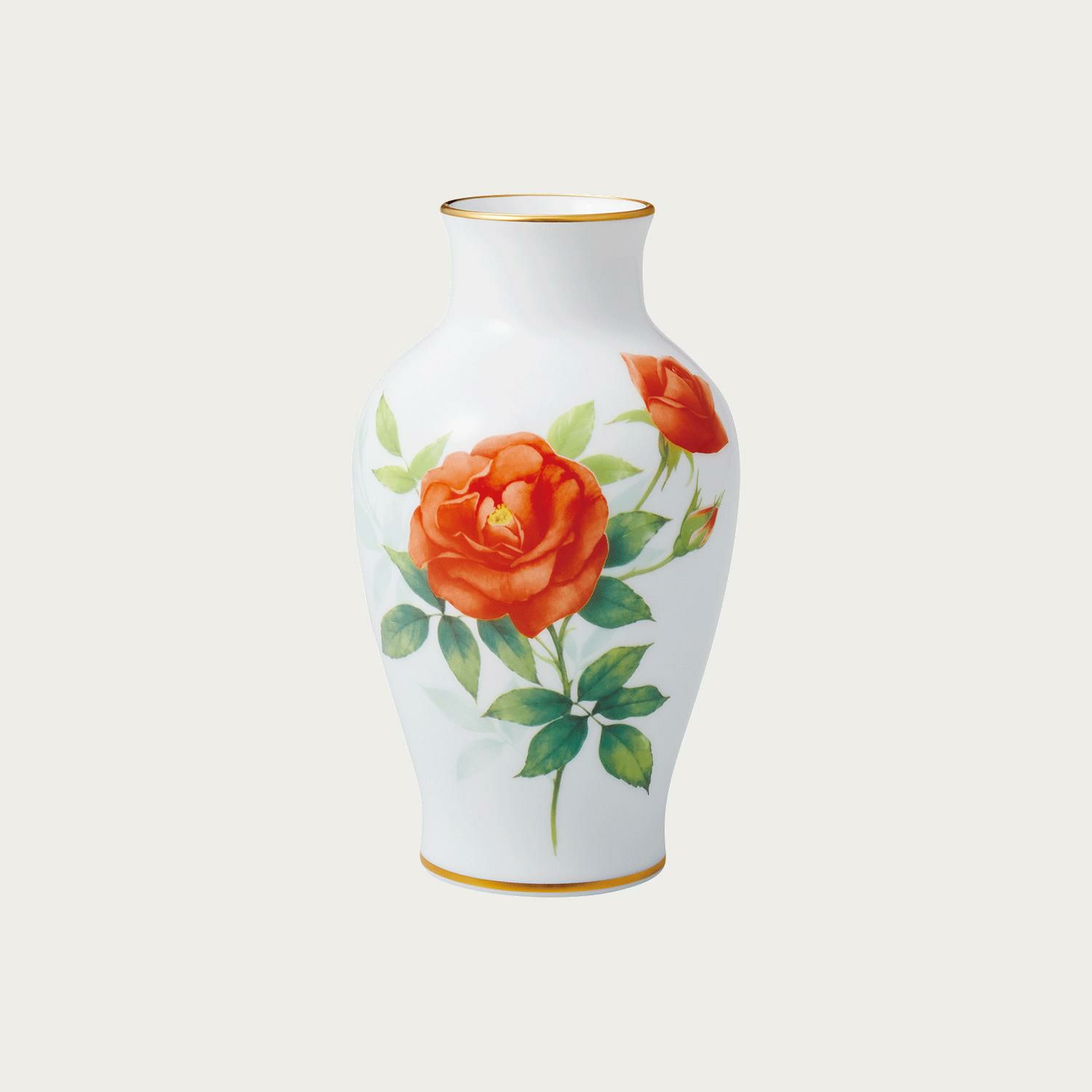 丸く可憐な花弁の「プリンセス・ミチコ」を、 使いやすい大きさの花器に配しました。艶やかな白磁の上に大きく開いたオレンジのバラが、お部屋を華やかに明るく演出いたします。