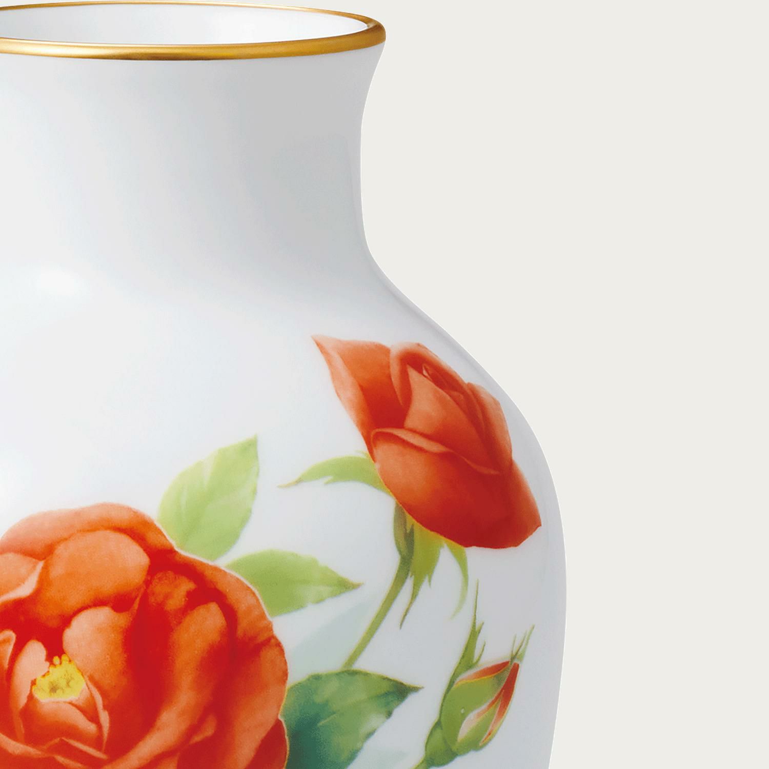 丸く可憐な花弁の「プリンセス・ミチコ」を、 使いやすい大きさの花器に配しました。艶やかな白磁の上に大きく開いたオレンジのバラが、お部屋を華やかに明るく演出いたします。