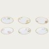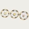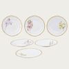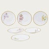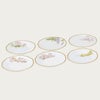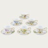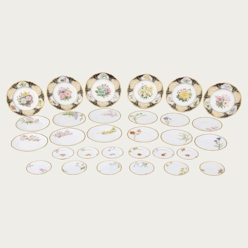 サービスプレートは廻(めぐ)る季節を6枚に表現し、ミート皿には木々の花を、フィッシュ皿には夏の花々を描き、デザート皿には野生の蘭を、ティーセットには山野草を、アイテムごとにテーマを設け花々を構成した壮大なスケールの逸品です。