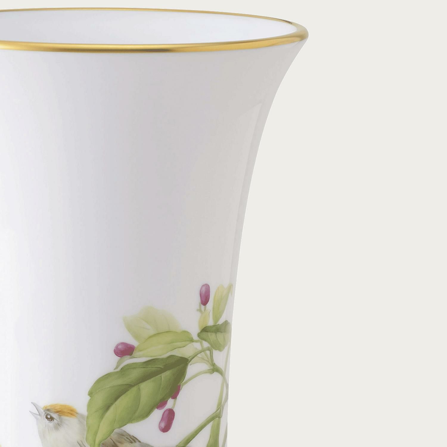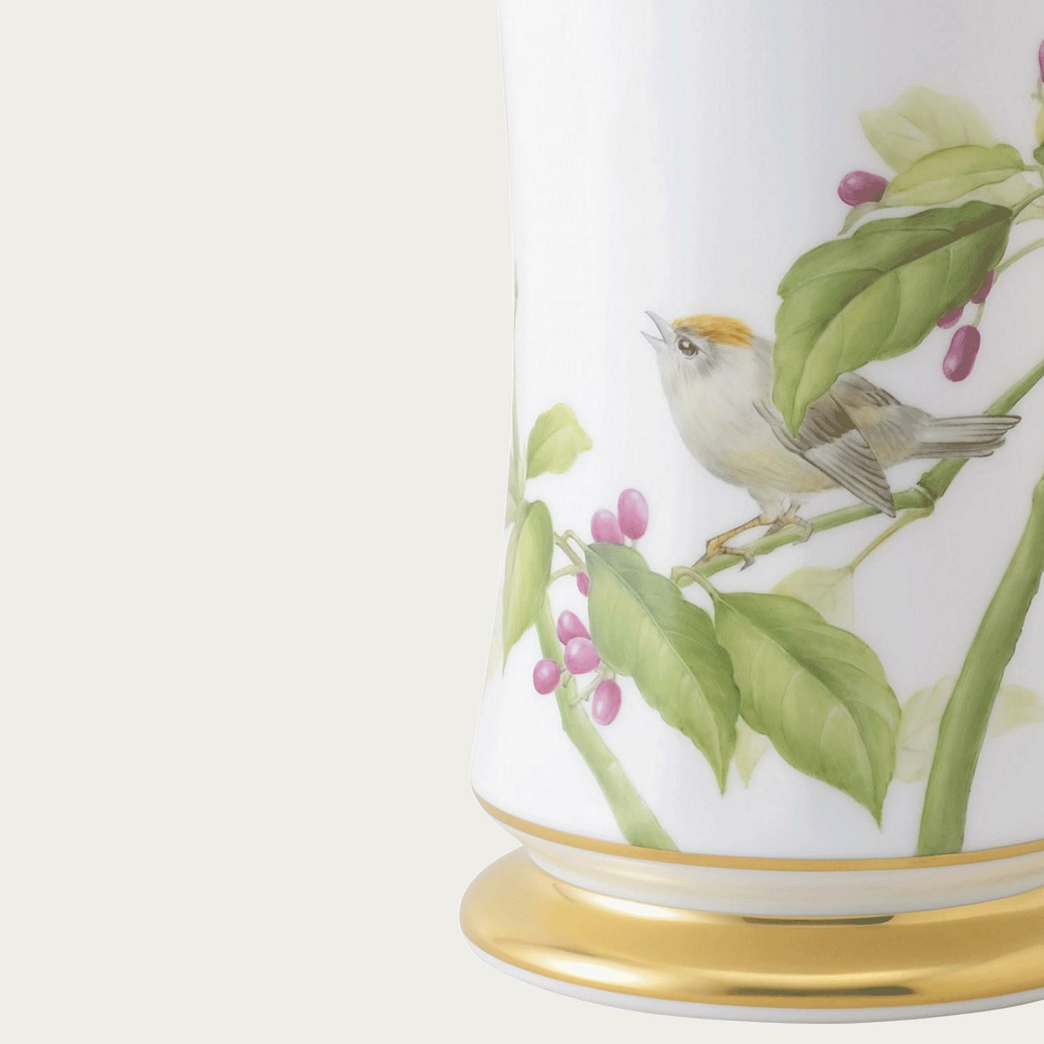 幸野楳嶺筆「百鳥画譜」より、キクイタダキと青木の絵を花瓶に配置し、彩色を施しました。