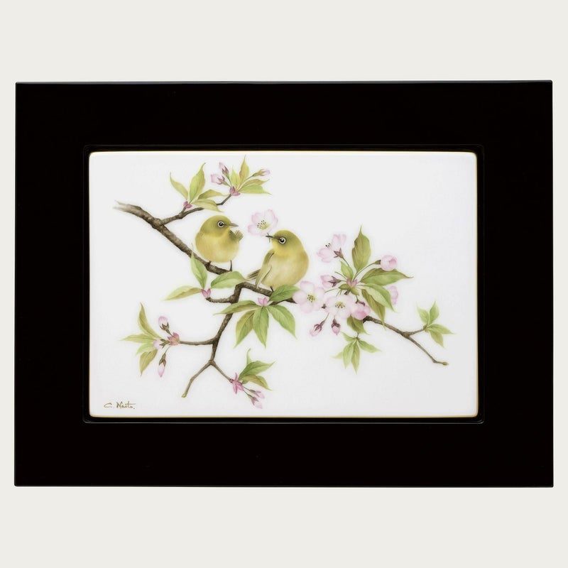 桜の花見・・・風に揺られて舞い落ちるのは、花びらではなく、一輪の桜。 風に飛ばされたのかと見上げると、どうやらメジロの仕業のようです。 花の蜜を探して飛び廻り、枝にとまって・・・ 二羽のメジロがチッチと会話をしながら花をついばみ、飛ばしています。 花の季節の短い桜と、小鳥との語らいを描きました。 ※こちらの商品は、2018~2020年までに開催された全国ご招待催事での展示品となります。 ※展示品のため、一部商品に微小な擦れ等が見受けられる場合がございます。