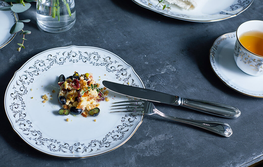 正式なコース料理ではデザート用にサービスされますが、ご家庭ではメインディッシュ用にお使いいただくのにも最適なサイズのデザートナイフ、デザートフォーク、デザートスプーンを2本ずつのセットにしました。