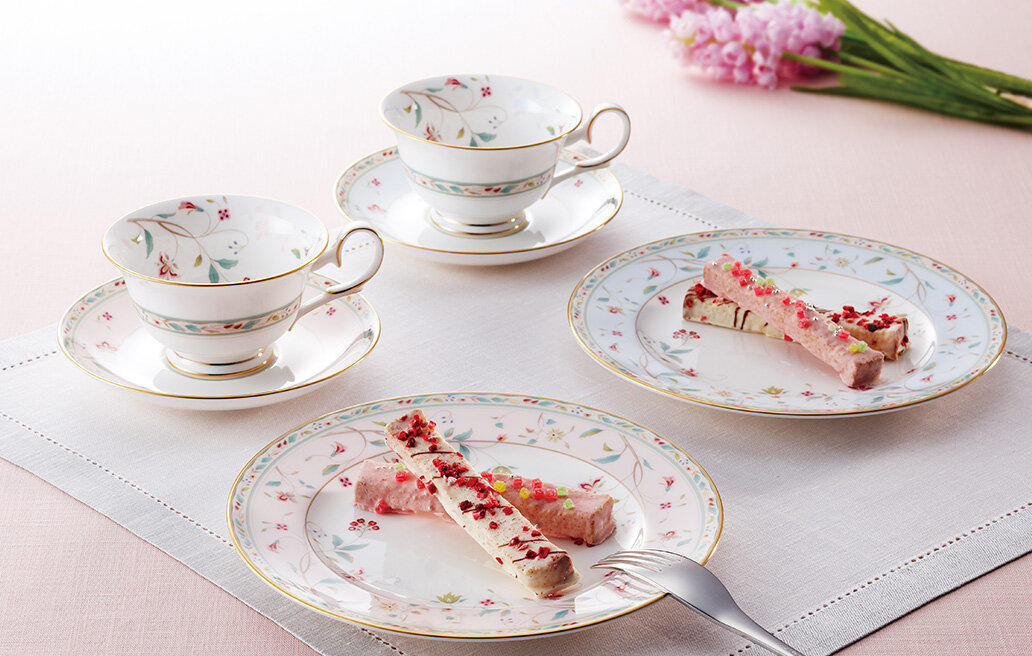 2014年、花更紗の発売25周年を機に、色変りアイテムが追加されました。従来の花更紗のモチーフにピンクとブルーの優しい色を加えたカップ&ソーサーやプレートは、よりエレガントで優雅なティータイムを演出します。