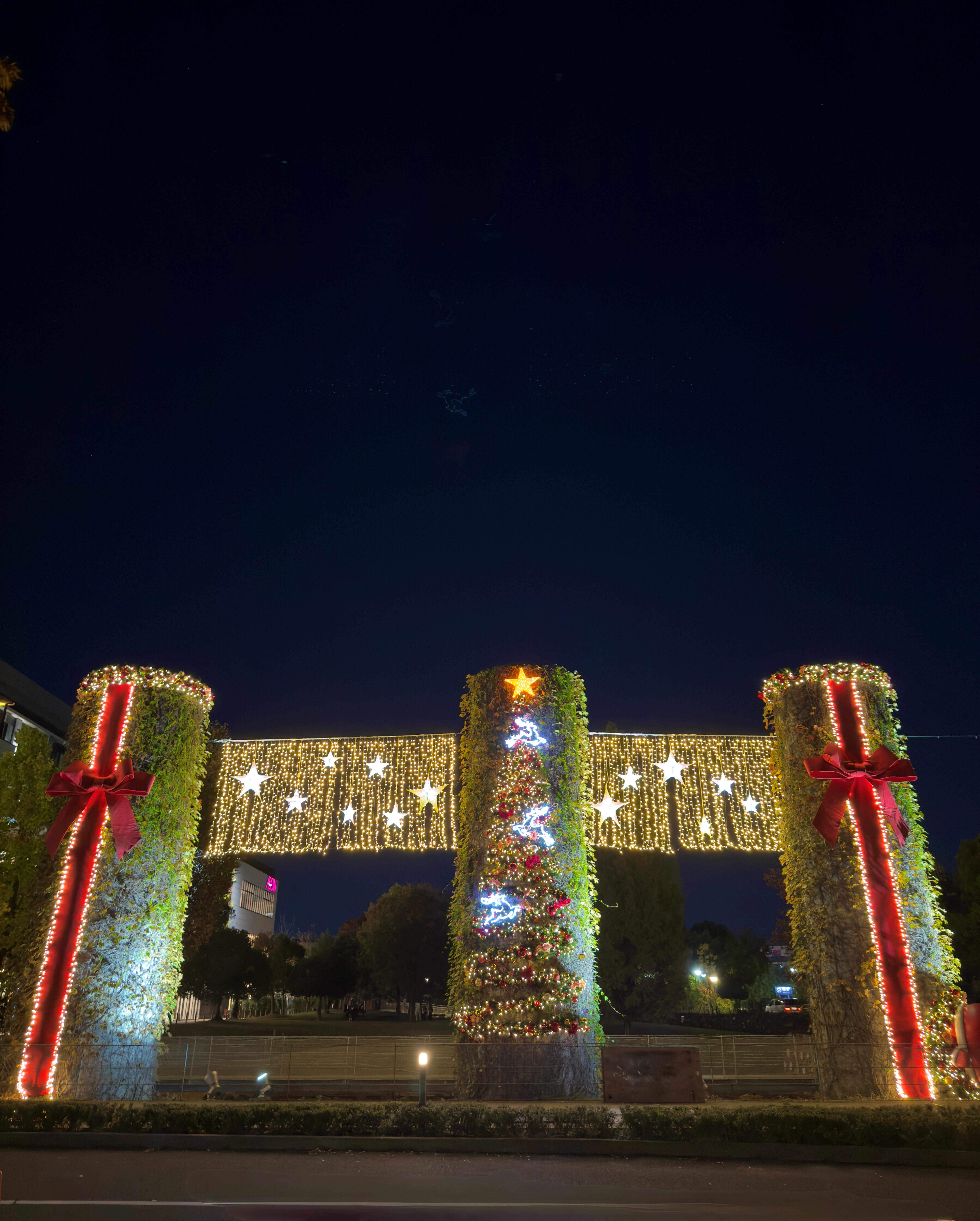 日没とともにクリスマスイルミネーションが灯り、園内は華やかな冬の光に包まれます。