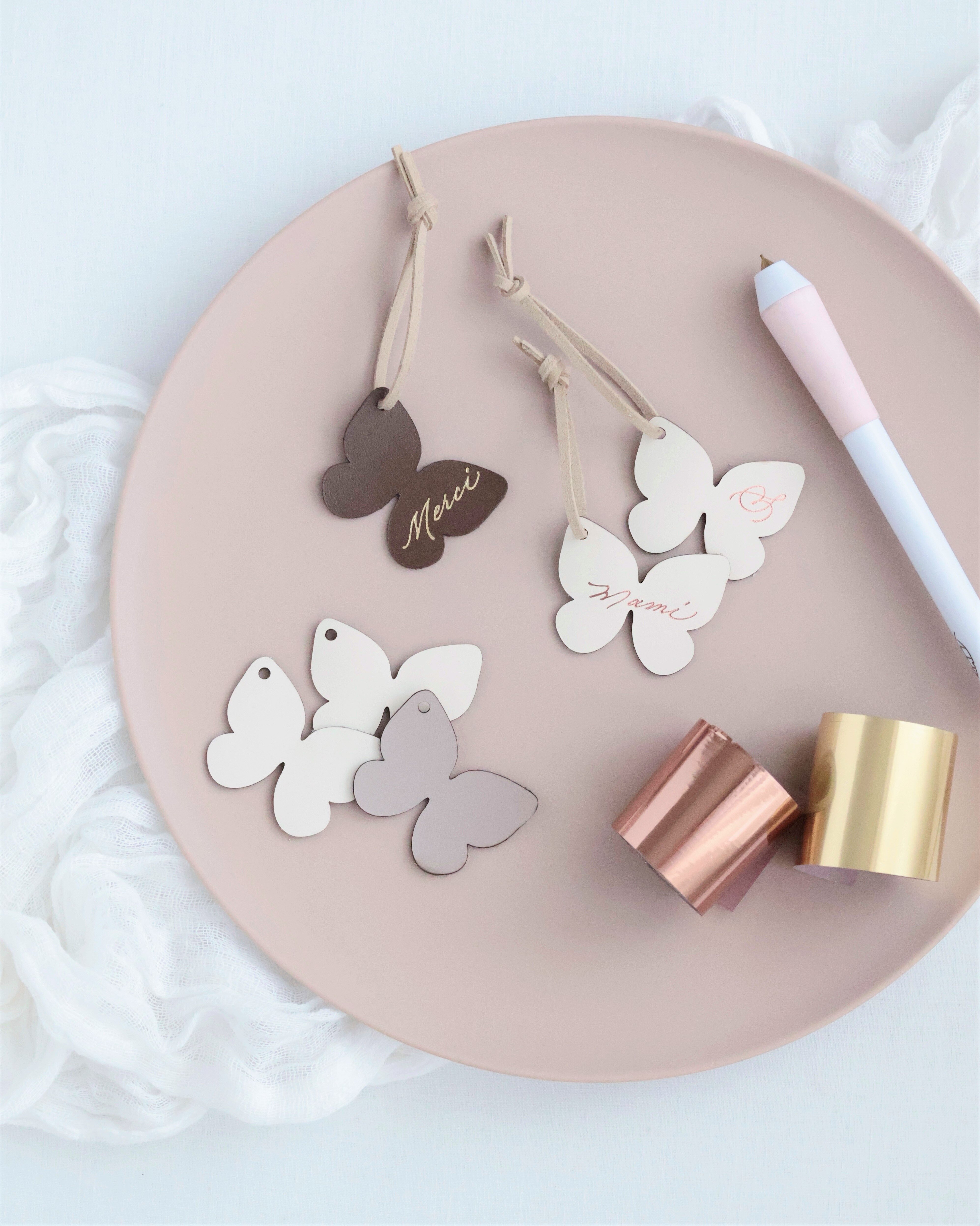 当日は、ギフトラッピング対象の商品を含め、合計5,500円(税込)以上ご購入の方先着40名様に、蝶々の形をかたどったオリジナルレザーチャームに、恵美さんがその場でモダンカリグラフィーでイニシャルやお名前などを筆耕する特別なノベルティーをプレゼントします。
